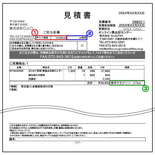 ご注文の際、「見積書」を「注文書」とお書き換えの上、ご使用ポイントを「②ポイント使用欄」にご明記いただき、FAXでお送りください。