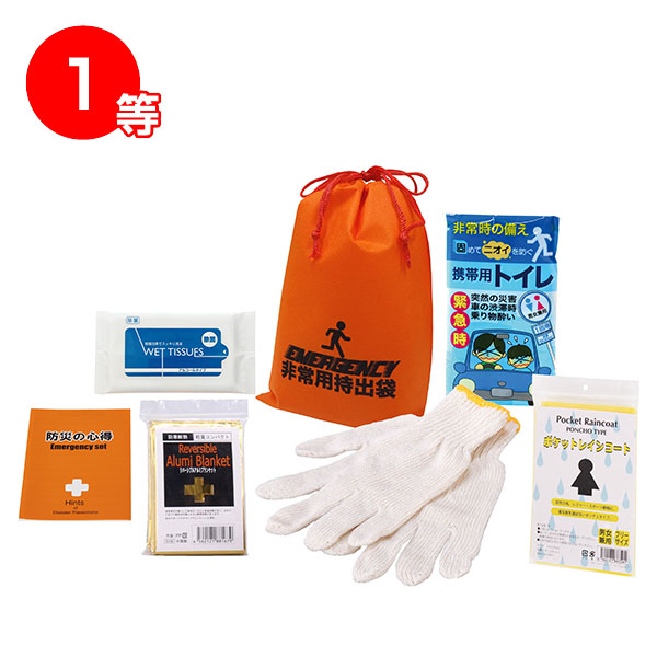 | 内容 | ●セット内容 特等 非常持出13点セットFX-30 1個 1等 コンパクト防災7点セットCB-10 2個 2等 折りたたみウォーターバッグ 3個 3等 静音アルミブランケット 4個 4等 役立つレジャーシート 5個 5等 携帯用トイレ1P 35個 ●付属品:抽選箱×1、くじ×50、明細表×1、店頭用お知らせPOP×2、A3ポスター×1 ---------- ●非常持出13点セットFX-30 セット内容:非常持出袋、除菌アルコールウェットティッシュ、アルミブランケット、水に流せるペーパー、緊急避難カード、レインコート、抗菌消臭トイレ、エマージェンシーホイッスル、マスク、救急4点セット、ダイナモLEDライト、8徳ナイフ、防災の心得 ●コンパクト防災7点セットCB-10 セット内容:収納巾着袋、アルミブランケット、軍手、レインコート、携帯用トイレ、防災ウェットティッシュ、防災の心得 ※一部色・柄・商品が変更になる場合があります。 ※お支払いは銀行振込でお願いいたします。 |