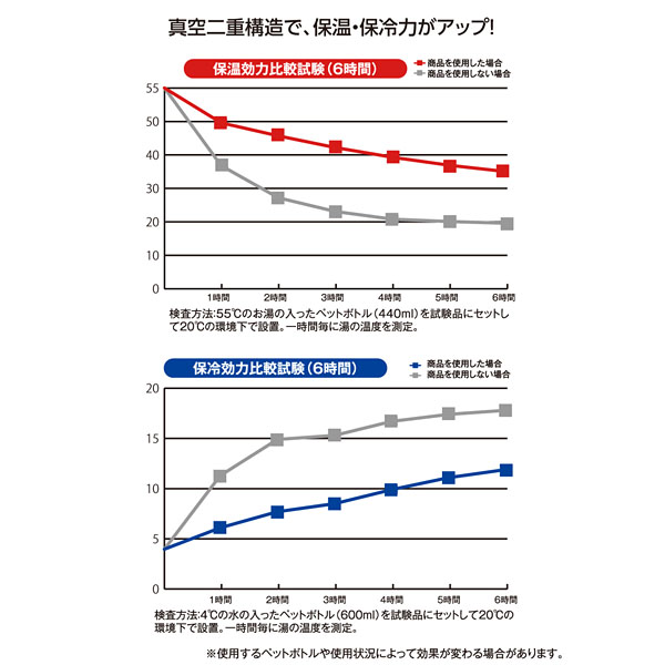 | 内容 | ペットボトルを差し込んでおくだけで温かさや冷たさをキープ! ●ペットボトルを入れ、キャップを締めて固定します。 ※形状により適合しない場合がございます。 ●500mlペットボトル対応 ●保温効力:55℃→38℃(6時間) 保冷効力:4℃→12℃(6時間) ●化粧箱入り ※ご注文は60個以上でお願いします。 |