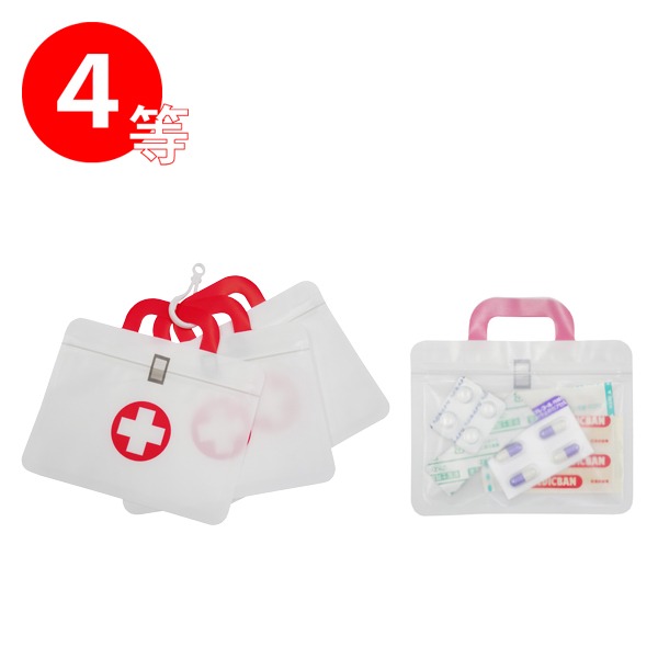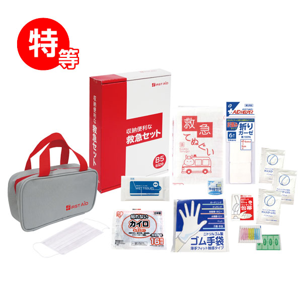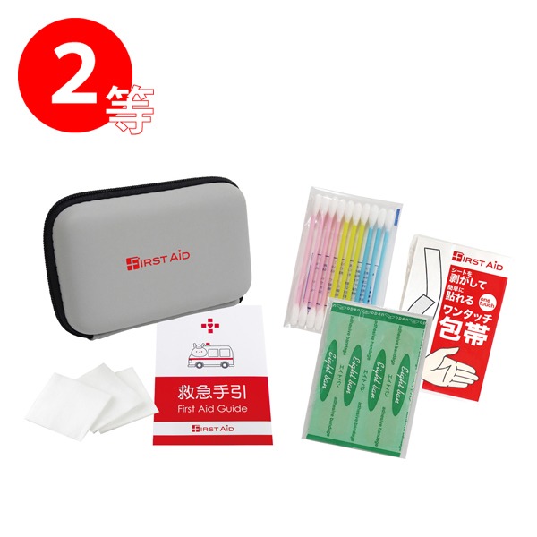 | 内容 | 日常で起きるケガの手当に、除菌も考えられた救急イベントキット ●セット内容 特等 収納便利な緊急14点セット FF-30N 1個 1等 コンパクトファーストエイドキット7点セット CF-10R 2個 2等 コンパクトファーストエイドキット6点セット CF-06 3個 3等 救急てぬぐい 4個 4等 救急ジッパーポーチ3P 90個 ●付属品:抽選箱×1、くじ×100、明細表×1、店頭用お知らせPOP×2、A3ポスター×1 ---------- ●収納便利な緊急14点セットFF-30N セット内容:収納ポーチ、抗菌伸縮包帯、カイロ、救急手ぬぐい、折りガーゼ、除菌アルコールウェットティッシュ、マスク、ワンタッチ包帯、ハンドジェル×3、綿棒10P、絆創膏5P、ゴム手袋 ●コンパクトファーストエイドキット7点セットCF-10R セット内容:収納ケース、救急手引、ワンタッチ包帯、絆創膏5P、綿棒10P、水に流せるペーパー、除菌アルコールウェットティッシュ ●コンパクトファーストエイドキット6点セットCF-06 セット内容:収納ケース、絆創膏5P、ワンタッチ包帯、綿棒10P、コットンパフ3P、救急手引 ※一部色・柄・商品が変更になる場合があります。 ※お支払いは銀行振込でお願いいたします。 |