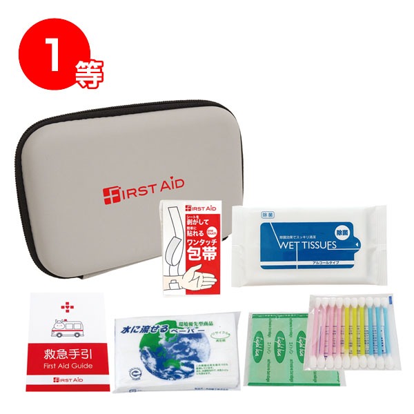 | 内容 | 日常で起きるケガの手当に、除菌も考えられた救急イベントキット ●セット内容 特等 収納便利な緊急14点セット FF-30N 1個 1等 コンパクトファーストエイドキット7点セット CF-10R 2個 2等 コンパクトファーストエイドキット6点セット CF-06 3個 3等 救急てぬぐい 4個 4等 救急ジッパーポーチ3P 40個 ●付属品:抽選箱×1、くじ×50、明細表×1、店頭用お知らせPOP×2、A3ポスター×1 ---------- ●収納便利な緊急14点セットFF-30N セット内容:収納ポーチ、抗菌伸縮包帯、カイロ、救急手ぬぐい、折りガーゼ、除菌アルコールウェットティッシュ、マスク、ワンタッチ包帯、ハンドジェル×3、綿棒10P、絆創膏5P、ゴム手袋 ●コンパクトファーストエイドキット7点セットCF-10R セット内容:収納ケース、救急手引、ワンタッチ包帯、絆創膏5P、綿棒10P、水に流せるペーパー、除菌アルコールウェットティッシュ ●コンパクトファーストエイドキット6点セットCF-06 セット内容:収納ケース、絆創膏5P、ワンタッチ包帯、綿棒10P、コットンパフ3P、救急手引 ※一部色・柄・商品が変更になる場合があります。 ※お支払いは銀行振込でお願いいたします。 |