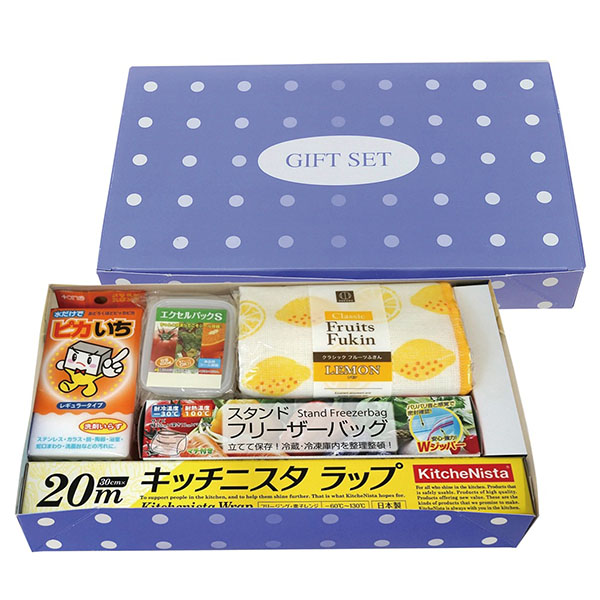 | 内容 | お掃除に便利なアイテムをセットしたギフトボックスです ●セット内容:エプロン×1、洗濯ポーチ×1、スポンジ×1、洗濯洗剤×1 ●化粧箱入り ※画像はイメージです。セット内容の指定は不可とさせていただきます。 ※一部色・柄・商品が変更になる場合があります。 ※ご注文は10個以上でお願いします。 |