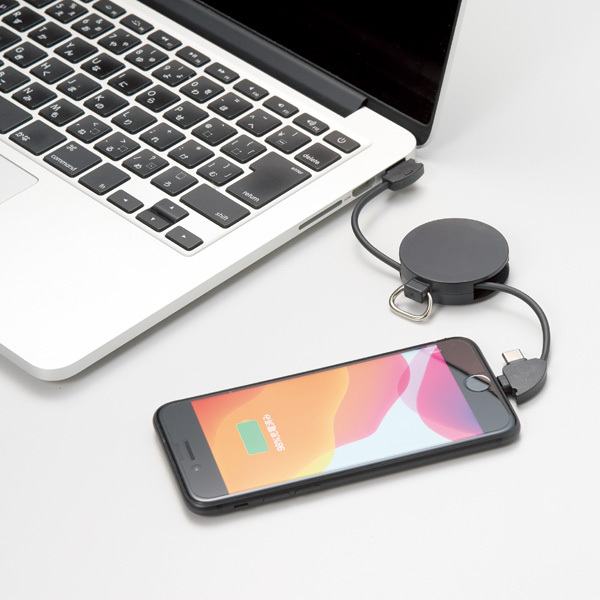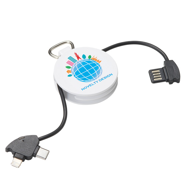 | 内容 | ケーブルを収納できるから携帯しやすい!3種に対応の充電ケーブル ●iPhone/Android、Type-Cに対応している充電コネクターです。 ●出力端子:Lightning/MicroUSBリバーシブルコネクタ×1、Type-C×1 ●包装袋入り ※ご注文は300個以上でお願いします。 |