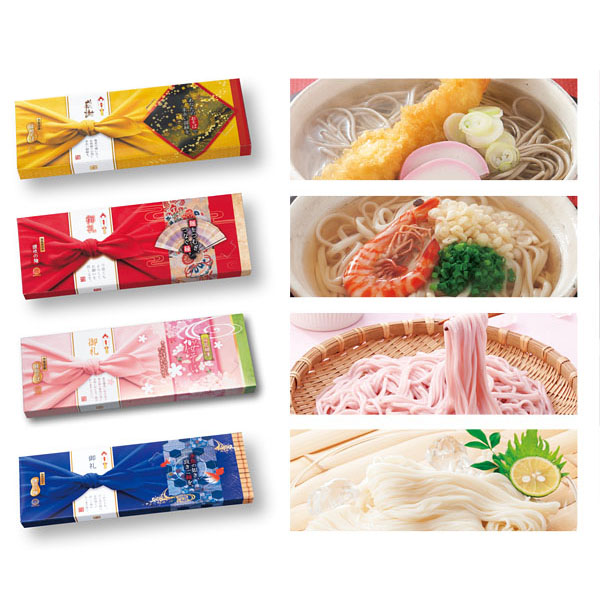 | 内容 | バラエティ豊かな4種類の麺が楽しめるギフトセット ●セット内容:桜そば180g(2食)×1、そうめん200g(2食)×1、讃岐うどん200g(2食)×1、そば180g(2食)×1 ●賞味期限:製造日より365日間(常温) ●お持ち帰りポリ袋同梱 ●化粧箱入り ※4種類のパッケージは印刷パッケージです。布は巻かれていません。 ※ご注文は12個単位でお願いします。 |