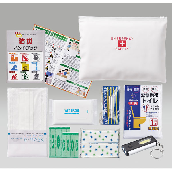 内容 | 棚や引き出しに常備しやすい帰宅支援を意識したセット B5収納箱タイプ ●【セット内容】 非常持出袋・防災の心得・ホイッスル・レインコート・抗菌消臭トイレ・発光スティック・アルミブランケット・除菌アルコールウェットティッシュ・タッチペン・緊急避難カード・水に流せるペーパー ●持出袋の裏面には、住所・氏名等の記入欄付き ●化粧箱入り ※セット商品の色・柄は写真と異なる場合があります。 ※ご注文は7個以上でお願いします。 |
