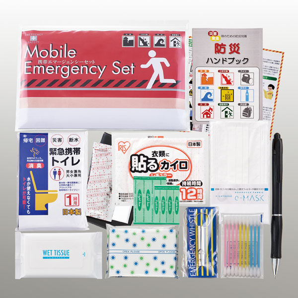 内容 | セット内容充実!化粧箱には、緊急時に役立つハザードマップポータルサイトへのQRコード付き ●セット内容:ウォーターボトル×1、レインポンチョ×1、アルミブランケット×1、2WAYライト×1、アイマスク×1、耳栓×1 ●単3形乾電池1本使用(別売) ●化粧箱入り ※ご注文は60個以上でお願いします。 |