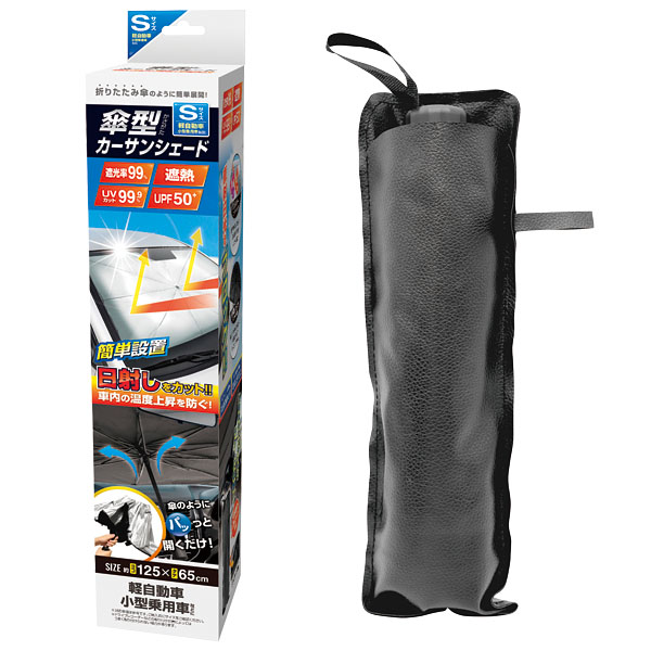 | 内容 | さっと開閉できる傘型構造。使いやすさ抜群のサンシェード。 ●傘のように簡単に開いて使用できます。 ●熱や紫外線をカットするシルバーコーティング。 ●UVカット率99.9% ●遮熱 ●UPF50+ ●収納ケース付き ●化粧箱入り ※ご注文は39個以上でお願いします。 |