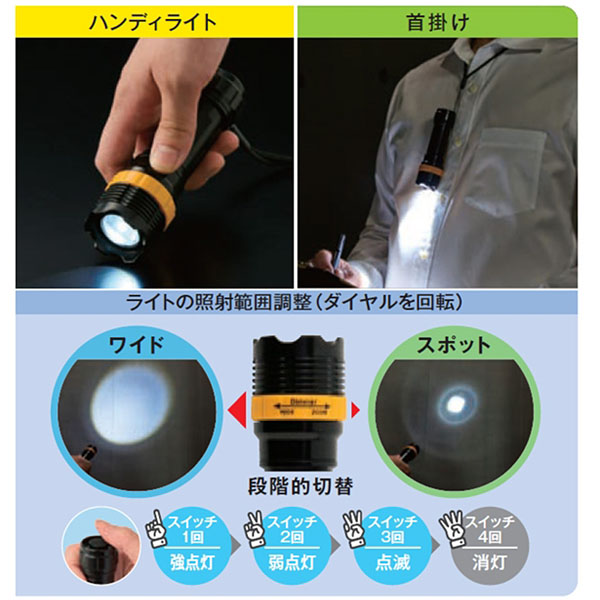 | 内容 | 一点集中も広範囲も照らせる!両手が開けられるネックストラップ付きのハンディーライト ●スイッチ1回で強点灯、2回で弱点灯、3回で点滅、4回でOFFとなります。 ●オレンジ色のダイヤルを回して照射範囲を調整できます。 ●単4形乾電池3本使用(別売) ●化粧箱入り ※ご注文は80個以上でお願いします。 ※お支払いは銀行振込でお願いいたします。 |