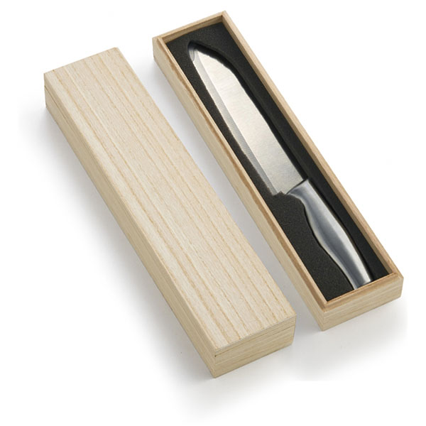 | 内容 | 美しく、手入れもしやすい一体成形の三徳包丁。 ●錆びにくく衛生的なオールステンレス製。 ●高級感のあるスリーブ付き桐箱入り。 ※ご注文は56個以上でお願いします。 |