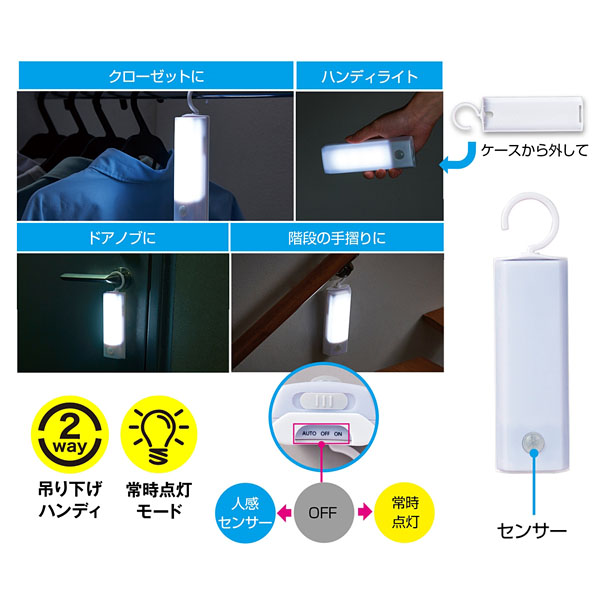 | 内容 | クローゼットやドアノブに吊り下げできるフック付きの人感センサーライト。手持ちのライトとしても。 ●単4形乾電池4本使用(別売) ●化粧箱入り ※ご注文は72個以上でお願いします。 |