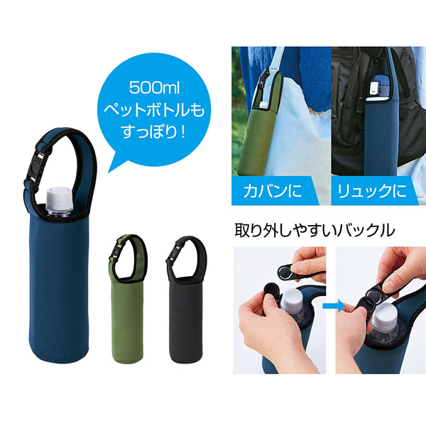 | 内容 | バックル付きのハンドルでバッグに取り付けられるシンプルなペットボトルカバー ●バッグに下げておけば、外出時でもサッと水分補給ができます。 ●ポリ袋入り ※ご注文は150個以上でお願いします。 |
