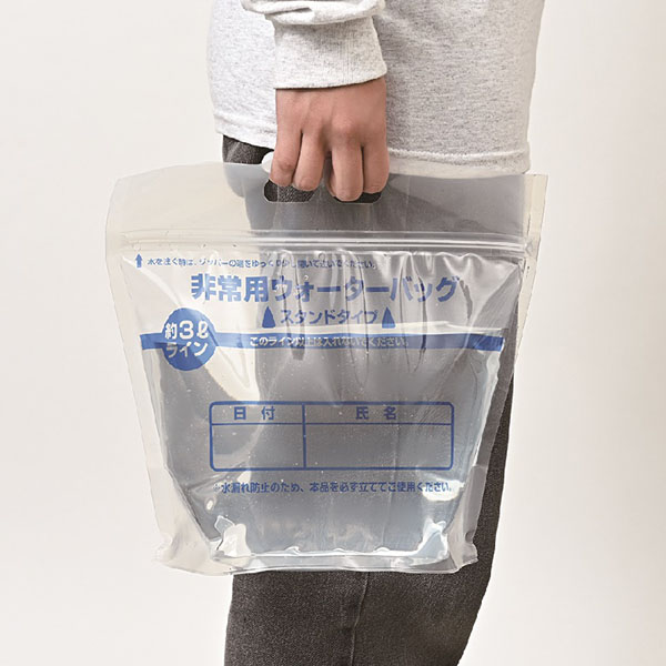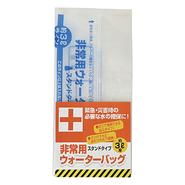 | 内容 | 緊急・災害時の必要な水の確保に! ●立てて使用できる自立タイプ! ●コンパクトに折りたたんで収納できる! ●持ち運べる手提げ穴付き ●容量:約3L ●カラー台紙付OP袋入 ※ご注文は100個以上でお願いします。 |