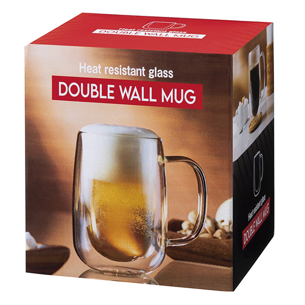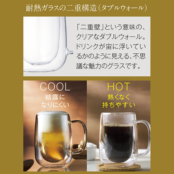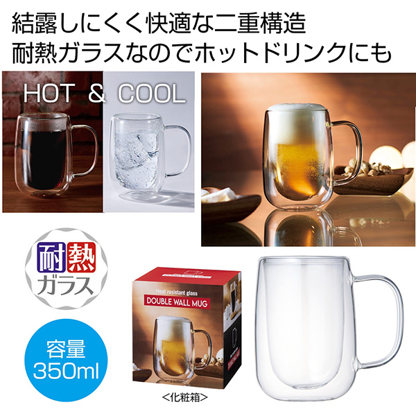 | 内容 | 結露しにくく快適な耐熱ガラス二重構造のジョッキ。 ●コールドドリンクは結露しにくく、ホットドリンクは熱くなく持ちやすい。 ●ドリンクが宙に浮いているような不思議な見た目もあいまって、魅力がたくさんあるジョッキです。 ●耐熱ガラス ●電子レンジ不可 ●容量:約350ml ●化粧箱入り ※ご注文は60個単位でお願いします。 |