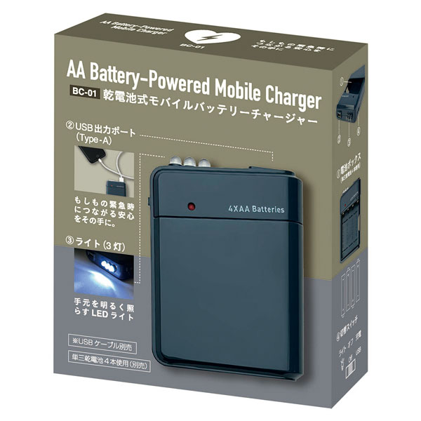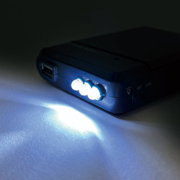 内容 | 保管性の高い乾電池と一緒に防災バッグに備えておけば、停電や災害時にも安心! ●手軽に充電できます。 ●USB出力(Type-A):USBケーブル(別売) ●LEDライト(3灯):手元を明るく照らすLEDライト ●電源:単三乾電池×4本(別売) ●化粧箱入り ※ご注文は48個単位でお願いします。 |