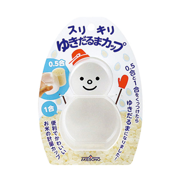 内容 | 0.5合と1合をくっつけたらゆきだるまになりました。 ●雑穀米やもち米を加えて炊く際の量の調整にも便利。 ●すりきり1杯でお米1合と0.5合の軽量ができます。 ●普通米・無洗米の目盛付き。 ●通常の計量カップとしても使えるmlの目盛付き。 ●日本製 ●台紙付きブリスターパック入り ※ご注文は39個以上でお願いします。 |