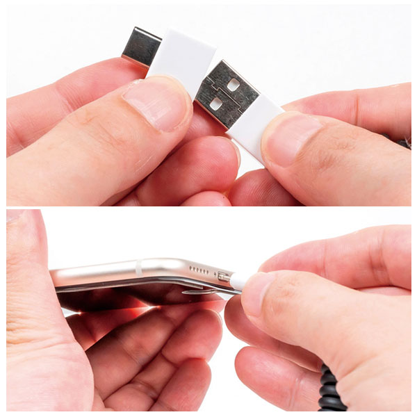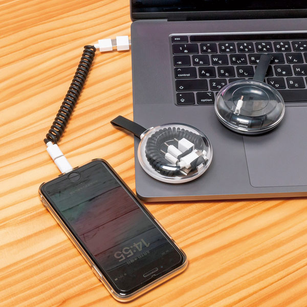 内容 | コンパクトなケースに収納されたスマートフォン用充電ケーブル。 ●3種類の変換プラグ付きで様々なポート形状に対応可能。 ●ケーブルは伸縮性があるコイル状なのでコンパクトに携帯できます。 ●充電出力:5V/2A ●対応ポート形状:microUSB、USB Type-C、Lightning ●重量:約52g ●化粧箱入り ※ご注文は100個単位でお願いします。 |