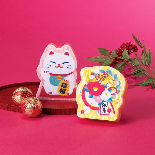 ●かわいい招き猫と華やかなお正月飾りのデザイン。
