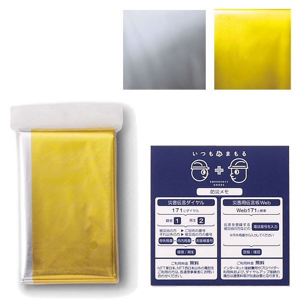 内容 | お子様やご年配の方にも持ち運びやすい、軽量&コンパクトな厳選防災アイテムをセットにしました。 ●セット内容:軍手、アルミブランケット、ホイッスル、ゴミ袋(3枚)、防災の心得帳、ボールペン、メモ帳、圧縮タオル、ポーチ ●ポリ袋入 ※商品のセット内容、パッケージのデザインが変更になる場合がございます。 ※ご注文は67個以上でお願いします。 |