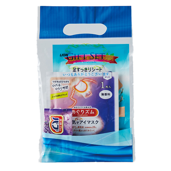 | 内容 | 毎日の疲れを癒すしあわせバスタイム。 ●心身共にご自宅で癒しの時間を過ごせる、少し贅沢なリラックスギフトセット。 ●セット内容:バブ(ラベンダーの香り)×1包、めぐりズム蒸気でホットアイマスク×1個、足すっきりシート休足時間2枚入り×1個 ●包装袋入り ※ご注文は100個単位でお願いします。 |
