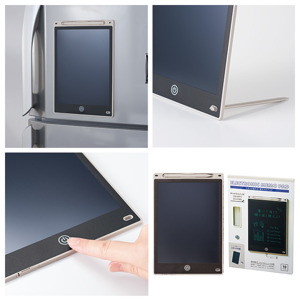 | 内容 | 書いて消せる電子メモパッドはビジネスマンや学生に大人気。 ●書いて消せて何度も使える電子メモは、環境に配慮したペーパーレス社会に貢献。 ●マグネットで冷蔵庫などに貼れる。 ●ワンタッチで消去。 ●一時的な保存にロック機能。 ●専用ペンでスタンドできます。 ●本体に収納できる専用ペンが付属。 ●10インチ ●コイン型電池1個付 ●化粧箱入り ※ご注文は80個以上でお願いします。 |