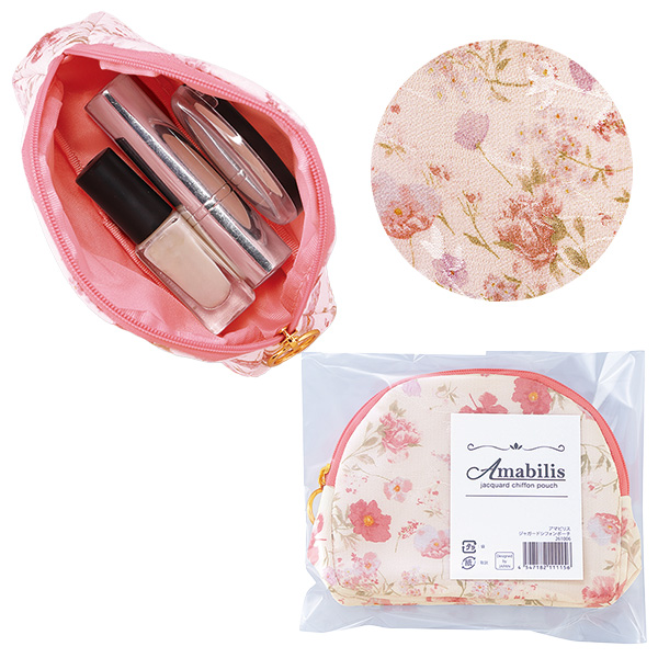| 内容 | 華やかな花柄が上品な、手のひらサイズのコスメポーチ。 ●リングタイプの引き手はゴールドで高級感UP! ●ジャガードシフォン生地の軽やかな質感。 ●大きく開く間口設計だから、使いたい小物が見つけやすく取り出し簡単。 ●ポストインサイズ ●ポリ袋入 ※生地の取り都合により、柄の出方が写真と異なる場合があります。 ※ご注文は100個以上でお願いします。 |