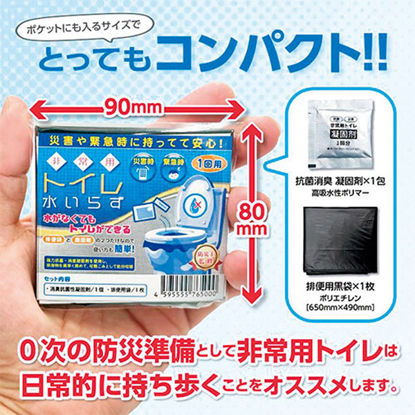 | 内容 | 場所を取らないコンパクトサイズなので、ご家庭または企業や自治体の方にも最適な非常用トイレ。 ●凝固剤はアルミ製パッケージ仕様なので、長期保存が可能。 ●セット内容:排便袋(黒)1枚、消臭抗菌性凝固剤(7g)1袋、取扱説明書1枚 ●重量:約20g ●日本製 ●OPP袋入り ※北海道、沖縄、および離島は別途運賃が必要です。 ※ご注文は100個以上20個単位でお願いします。 |