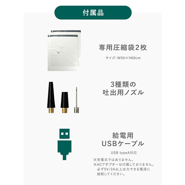| 商品サイズ | 約W49×D49×H108mm 圧縮袋:約W500×H600mm 給電用USBケーブル:約1800mm |