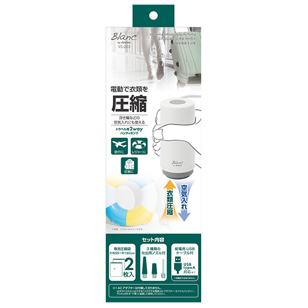 | 内容 | トラベル・アウトドアに!Type-Cでさらに便利な1台2役。 ●持ち運びに便利なハンディタイプ。 ●スイッチ1つで吸引・圧縮/空気入れ。 ●衣類をコンパクトに収納。 ●空気入れが大変な浮き輪やビーチボールなどもらくらく。 ●空気入れ用3種類の吐出用ノズル付。 ●洗えるノズル&アタッチメント。 ●質量:約165g ●個装重量:約390g ●入力:DC5V 2A、USB Type-C ●流量:約6.0L/min ●脱気圧:約-50kPa ●吐出圧:約100kPa ●付属品:専用圧縮袋 2枚(ジッパースライダー付き)、吐出用ノズル3種類、給電用USBケーブル1本(USB Type-AーUSB Type-C) ●ヘッダー付き化粧箱入り ※ご注文は4個以上でお願いします。 |