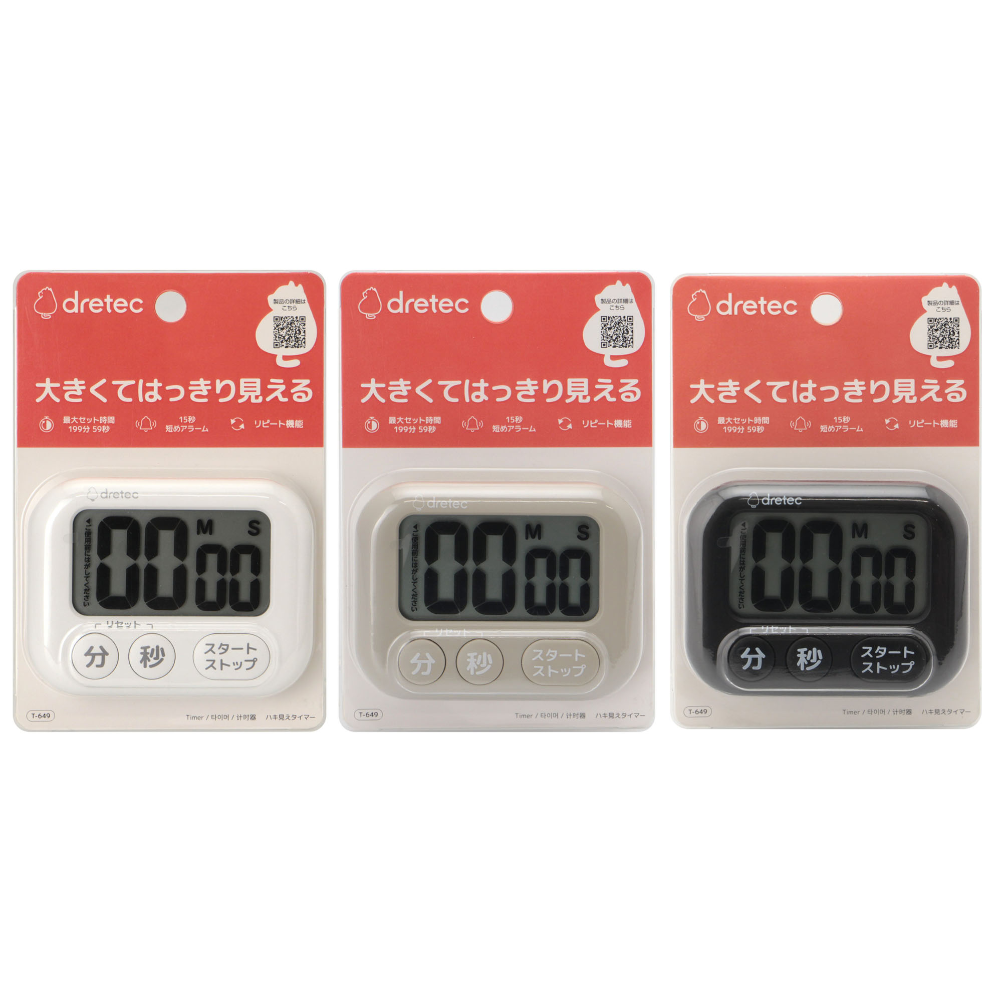 | 内容 | 大きくはっきり見えるタイマー。 ●リニューアルした3キータイマー。 ●長時間はかれる。(199分59秒) ●大きく押しやすくなったボタン。 ●「分」「秒」ボタンでかんたんセット。 ●見やすい大画面表示。 ●もとのセット時間にもどるリピート機能。 ●立てかけスタンド、マグネット、壁掛けフック ●質量:約68g(電池を含む) ●個装重量:約86g ●単四形乾電池1個使用 ●表示方法:液晶デジタル5桁 ●最大セット時間:199分59秒 ●カウントアップ最大計測時間:199分59秒 ●アラーム鳴動時間:約15秒 ●動作温度範囲:0〜40℃ ●電池寿命:約1年(1年2回 各15秒アラームを鳴らした場合) ●ヘッダー付きブリスターパック入り ※ご注文は16個以上でお願いします。 |