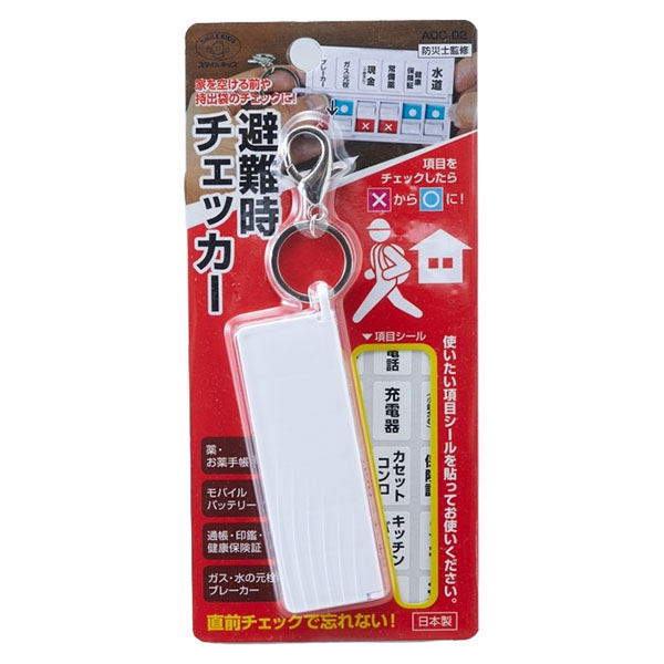 | 内容 | 出かける前や持出袋のチェックに! ●付属品:項目シール(ブレーカー、ガス元栓、水道、現金、常備薬、非常食、ランタン、母子手帳など28枚+白紙7枚) ●重量:45g ●日本製 ●ブリスターパック入り ※ご注文は14個以上でお願いします。 |