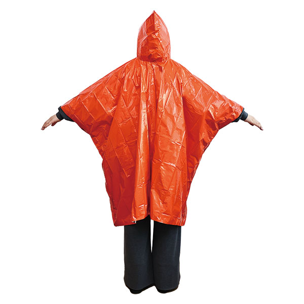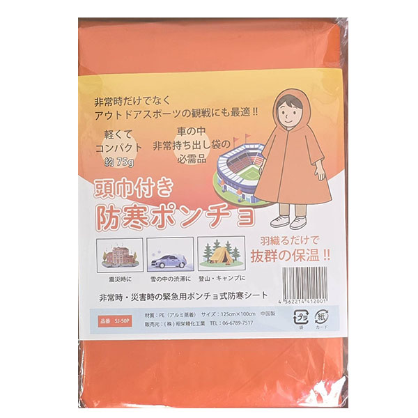 | 内容 | ポンチョタイプで避難時の作業にも最適! ●表面は、緊急時に目立つオレンジ色。 ●裏面は、熱を逃がさないアルミ蒸着PE。 ●重量:75g ●袋入り ※ご注文は25個以上でお願いします。 |