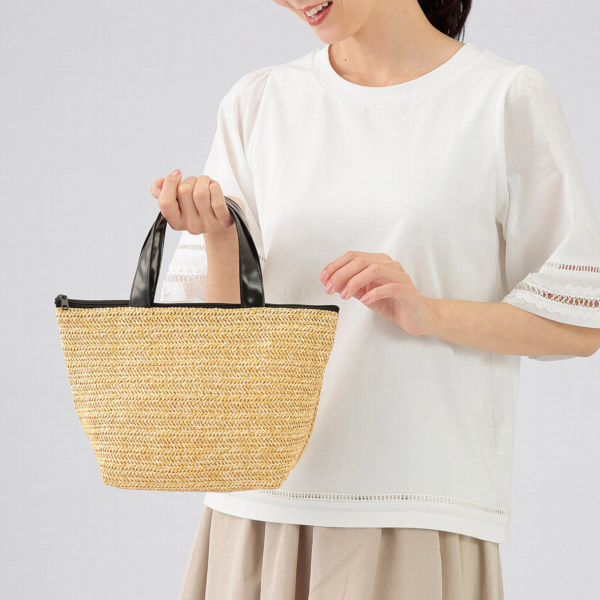 | 内容 | 持つだけで一気に夏気分!涼しげな雑材風トート。 ●軽やかで扱いやすく、デイリーからお出かけまで大活躍! ●口元:ファスナー ●袋入り ※ご注文は74個以上でお願いします。 |