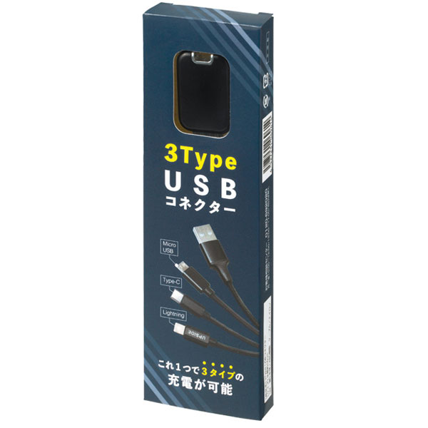 | 内容 | あれこれ持ち歩かなくてもOK!これひとつで3タイプの充電に対応! ●付属コネクタ:Type-A、Type-C、micro USB、Lightning(Lightningケーブルは片面充電仕様) ●最大出力:DC5V/2A(コネクタ同時使用の場合は合計最大2A、数値は使用状況により変動) ●充電のみ(※データ転送不可) ●名入れが見える窓開きタイプのパッケージ。 ●レーザー加工した場合、通電時に光ります。(※一定の明度ではありません。) ●化粧箱入り ※ご注文は77個以上でお願いします。 |