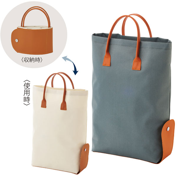 | 内容 | クルッとまとめてコンパクトに! ●上品なくすみカラーの折りたたみトート。 ●本体側面にボタンを留めるとマチあり仕様に。 ●ポリ袋入り ※ご注文は75個以上でお願いします。 |