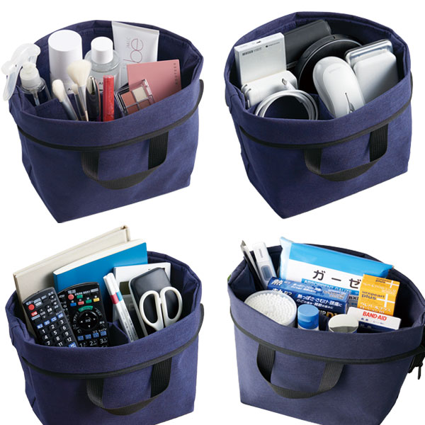 | 内容 | 収納ボックス型のバッグだから災害時の持ち出しにも便利。 ●トートバッグと収納ポーチの2WAY。 ●3つの仕切りで分別収納。 ●中身を見やすいボックス形状。 ●リビング小物、ガジェット、メイク道具入れとして。 ●包装袋入り ※ご注文は60個以上でお願いします。 |