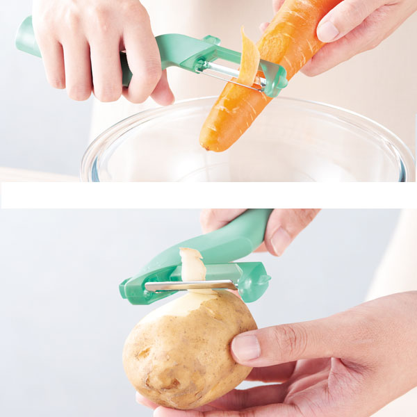| 内容 | T型・I型を用途で切り替えられて、ひとつあれば下ごしらえラクラクのピーラー。 ●くるっと回して簡単切替。 ●I型:ゴボウなど細い野菜の皮むきやささがきなどに。 ●T型:当てて引くだけ。皮むきがラクラク。 ●ジャガイモ用芽取り ●化粧箱入り ※ご注文は180個以上でお願いします。 |