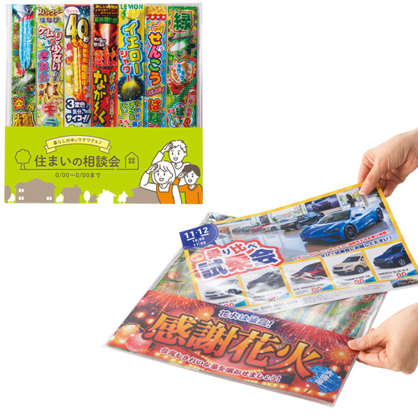 | 内容 | 夏の定番、花火セット。 ●チラシを入れられるポケット付き。 ●花火ルール10ヶ条 1.使用する前に明るいところで注意書をよく読んでから遊びましょう。 2.花火を分解したりほぐしたりしてはいけません。大変キケンです。 3.花火の点火にマッチやライターを使ってはいけません。蝋燭や点火用線香で点火してください。 4.お子様は大人と一緒に遊びましょう。 5.花火は必ず広い場所で遊びましょう。人や家に向けたり、振り回したり、燃えやすい物の側で遊ばないようにしましょう。 6.花火は1本ずつ、風下に向けて点火しましょう。また、花火をしている人の前後に立たないようにしましょう。 7.バケツに水をいっぱい用意しましょう。 8.風の強い日には、花火遊びをやめましょう。 9.花火が途中で消えたり、なかなか点火できない場合でも、絶対に覗いたり顔や体を近づけてはいけません。 10.遊ぶ場所や時間は、他の人の迷惑にならないようにし、花火遊びが終わったら、ゴミは必ず持ち帰りましょう。 ●オリジナル台紙も作成可能。詳しくはお問い合わせください。 ●包装袋入り(ポケット付) ※ご注文は100個単位でお願いします。 |